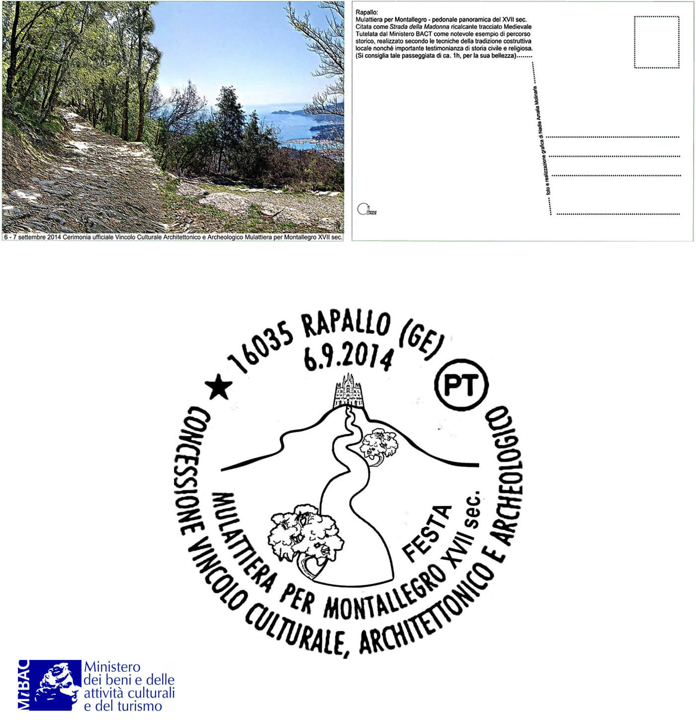 "in data 25.01.2013 il Circolo della Pulce presenta istanza al Ministero per i Beni e le Attività Culturali e del Turismo il quale emette provvedimento favorevole, firmato in data 12.12.2013, DECRETANDO che "il bene denominato Salita al Santuario di Montallegro è dichiarato di interesse culturale ai sensi dell'Art. 10 comma 1 del D. Lgs. 22 gennaio 2004 n. 42 e sottoposto a tutte le disposizioni di tutela contenute nel decreto in quanto la salita, risalente nella sua configurazione attuale al secolo XVII costituisce un notevole esempio di percorso storico, realizzato secondo le tecniche della tradizione costruttiva locale, nonché importante testimonianza della storia civile e religiosa della città di Rapallo"... inoltre ritenendo " che la strada pedonale in oggetto ricalchi una viabilità medievale"... lo qualifica a rischio archeologico elevato richiamando le norme di tutela del D. Lgs. 22 gennaio 2004 n. 42 Codice dei Beni Culturali in particolare gli Artt. 28, 90, 91;" il 6 settembre 2014 in occasione dei festeggiamenti per l'ottenimento di tale vincolo le Poste Italiane su richiesta del C.d.P emettono Speciale Annullo Filatelico.