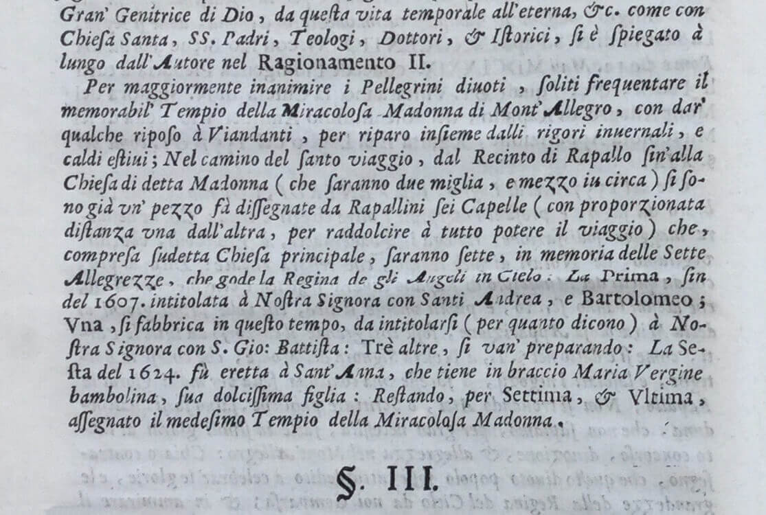 Per maggiormente inanimire i Pellegrini divoti, soliti frequentare il memorabil’ Tempio della Miracolosa Madonna di Mont’Allegro, con dar’ qualche riposo à Viandanti, per riparo insieme dalli rigori invernali, e caldi estivi; Nel camino del santo viaggio, dal Recinto di Rapallo sin’ alla Chiesa di detta Madonna (che saranno due miglia, e mezzo in circa), si sono gi à un’ pezzo f à dissegnate da Rapallini sei Capelle (con proporzionata distanza una dall’altra, per raddolcire à tutto potere il viaggio) che, compresa sudetta Chiesa principale, saranno sette, in memoria delle Sette Allegrezze, che gode la Regina de gli Angeli in Cielo: La Prima, sin del 1607. intitolata à Nostra Signora con Santi Andrea, e Bartolomeo; Una, si fabbrica in questo tempo, da intitolarsi (per quanto dicono) à Nostra Signora con S. Gio: Battista: Tr è altre, si van’ preparando: La Sesta del 1624. f ù eretta à Sant’Anna, che tiene in braccio Maria Vergine bambolina, sua dolcissima figlia: Restando, per Settima, et Ultima, assegnato il medesimo Tempio della Miracolosa Madonna.