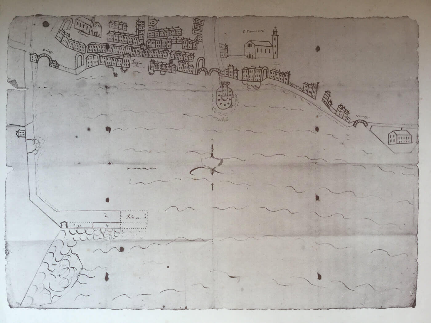 Il sentiero che i rapallesi e i fedeli diretti al Santuario iniziarono a utilizzare, in alternativa alla ‘strada della Madonna’, aveva origine nei pressi della chiesa di San Francesco, alla foce del torrente omonimo, non lontano da una delle cinque porte di accesso al Borgo: oltre a quella di San Francesco, si poteva accedere al centro abitato attraverso quelle di Sant’Antonio, del Mulinetto, degli Orti e delle Saline. In un documento del 1629 Rapallo viene definito ‘borgo murato’ (ovvero dotato di mura), delimitato da due torrenti, il ‘Bogo’ (Boate) e il San Francesco, e da un sistema di mura verosimilmente coincidente con i muri delle case da una parte, verso i monti, e con il mare dall’altra. Alcune delle cinque porte sono identificabili ancora oggi: quella di Sant’Antonio, contigua all’omonimo ospedale (oggi sede del Municipio) fu demolita nel 1702 e riedificata non distante, all’incrocio delle strade che portavano alla chiesa e convento di Sant’Agostino e alla strada che collegava Rapallo alla Fontanabuona. A oriente del Borgo la porta di San Francesco conduceva verso Chiavari e quella più a settentrione, detta del Mulinetto, verso il passo della crocetta e l’‘Oltremonte’. Ad occidente, ricostruite a metà del XVI secolo sulle rovine di altre porte preesistenti, la porta degli Orti, attraverso cui passava la via Romana per Genova, e la porta delle Saline da cui partiva la strada per i borghi di Pagana, Santa Margherita e Portofino.