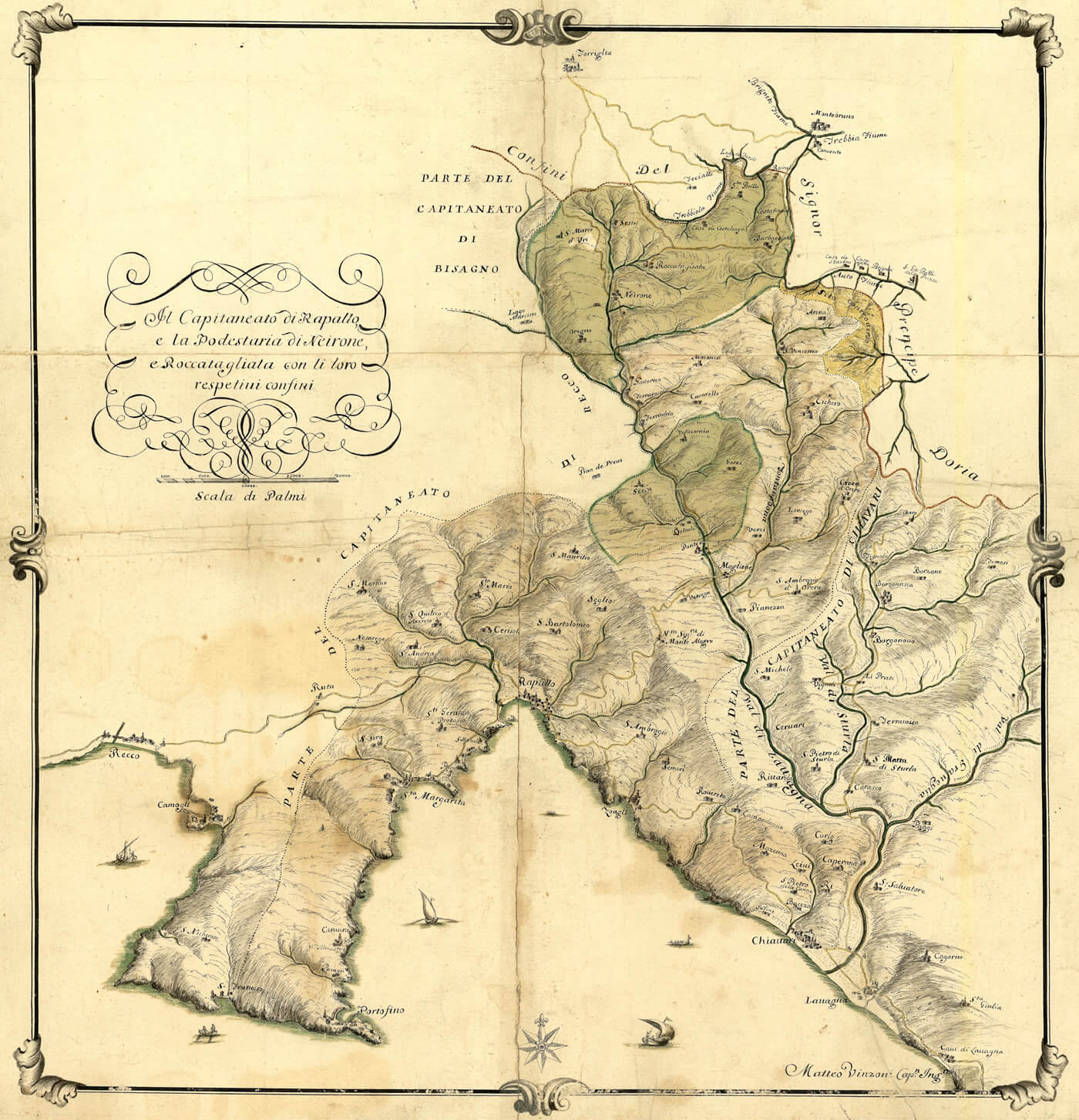 Col passare del tempo il sentiero assunse un’importanza e una notorietà che andava ben oltre i confini del capitaneato e delle numerose parrocchie che avevano ufficialmente riconosciuto come patrona la madonna di Montallegro. Questa evidenza è dimostrata, oltreché dalle numerose testimonianze scritte, anche da una mappa realizzata nel 1725 dal cartografo Matteo Vinzoni, figlio d’arte e autore di numerose mappe geografiche e topografiche commissionate dalla Repubblica di Genova. Il pregevole documento mostra con insolita cura di dettagli il territorio del capitaneato di Rapallo e la podestaria di Neirone e Roccatagliata (l’attuale alta Val Fontanabuona) con i rispettivi confini. Nella mappa si possono facilmente individuare le ville (oggi frazioni) di Rapallo, a dire il vero con qualche errore evidente di posizionamento, ma soprattutto, con linee color giallo ocra piuttosto marcate, il sentiero che dall’abitato di Rapallo portava a Montallegro, segno evidente dell’importanza che quel percorso aveva negli anni in cui fu realizzato il prezioso disegno.
