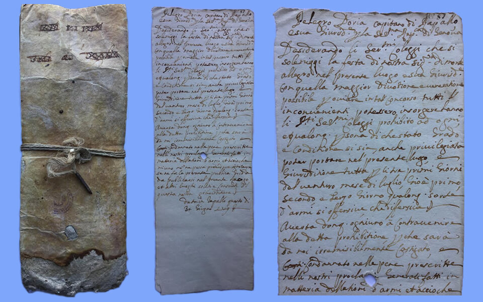 La pena si presume fosse molto severa allo scopo d’impedire ai fedeli di giungere al santuario in stato di ubriachezza, con la conseguente possibilità che potessero scoppiare risse e tumulti, avvenimenti non insoliti a quel tempo. Il desiderio delle autorità di evitare episodi incresciosi durante i festeggiamenti è confermato anche dal fatto che nei documenti dell’archivio storico comunale non è insolito trovare disposizioni delle autorità che, proprio a partire dalla fine del mese di giugno di ogni anno, proibivano il porto d’armi sul sentiero che collegava il centro abitato di Rapallo a Montallegro, dove evidentemente si concentrava il maggior numero di persone. Un documento dell’Archivio storico comunale, datato 30 giugno 1719, conferma e chiarisce meglio queste disposizioni.(foto in alto)